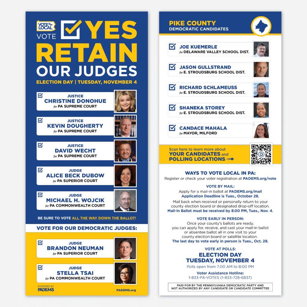 - Vote Yes to Retain Our Democratic JudgesThis November 4th election is critical for maintaining the balance of power on Pennsylvania’s highest court. Three Democratic Supreme Court justices are up for retention, and the outcome will shape decisions on voting rights, reproductive rights, redistricting, and more. PA